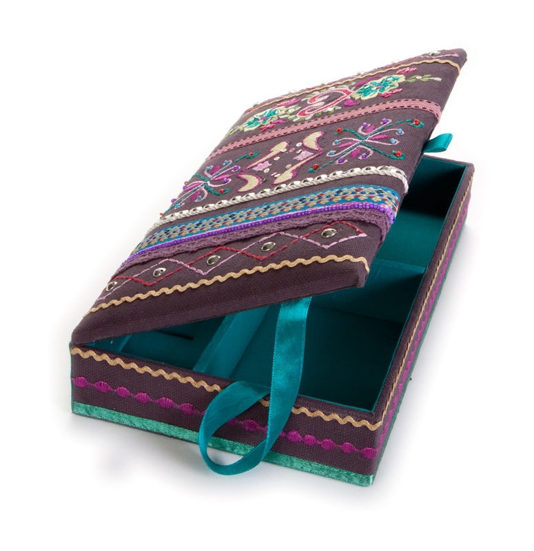 Dit sieradendoosje is gemaakt volgens traditionele handwerktechnieken die van generatie op generatie worden doorgegeven. Het doosje is bekleed met stof en versierd met borduursels.