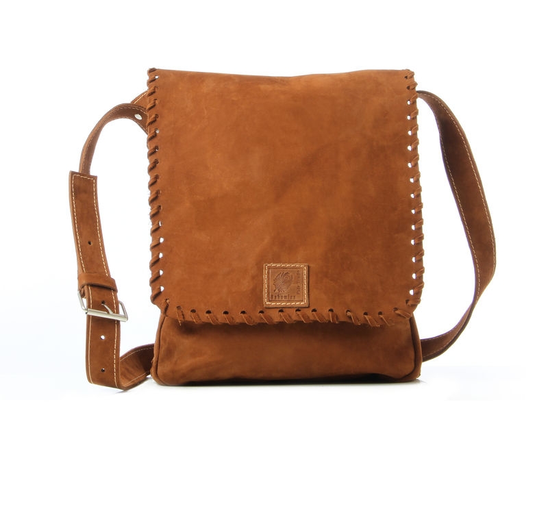 Stoere kleptas van nubuck rundleer met magneet sluiting. Afmetingen: 35cm H x 28cm B x 5cm D. Brede schouderriem (5cm breed) tot max 120cm lang.